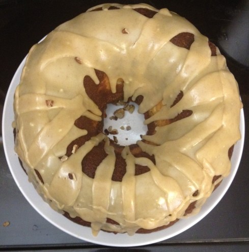 Before you pour your batter in the pan, sprinkle the nuts in it (after spray/greasing/flouring the pan); instead of icing, after your removed the cooked cake from the oven, melt together a stick of real butter, a cup of sugar, and 1/2 cup of water (can substitute 1/2 the water with rum or other liquor and add as much as an additional 1/4 cup rum/liquor) – bring to a boil and boil for at least 3 minutes, stirring constantly; once the cake has cooled IN THE PAN for about 15 minutes, pour the glaze over it, letting it run down the sides of the cake into the pan; after another 10-15 minutes cooling in the pan, turn out the cake.